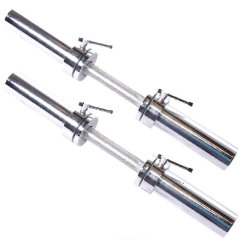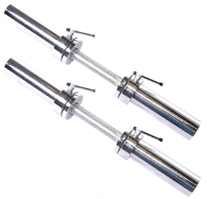 Juego de 2 barras olímpicas cromadas con collarin tipo tornillo. Tiene empuñadura con textura y mangas rotativas. El que tenga mangas que giren, ayuda a eliminar la inercia rotacional que se experimenta al usar las mancuernas por lo qeu te ayuda a enfocar mas el esfuerzo y disminuir la posibilidad de lesiones.