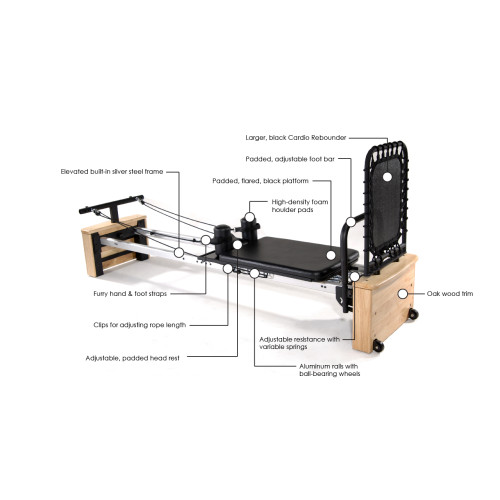 Su estructura está hecha de Acero con rieles de aluminio y Madera de Roble lo que le da el look mas sofisticado de las camas de Pilates que encontrarás en los Studios Pilates mas exclusivos. Esta cama de Aeropilates es una versión mejorada de nuestra línea mas económica buscando satisfacer las necesidades y preferencias de deportistas mas entusiastas y exigentes.